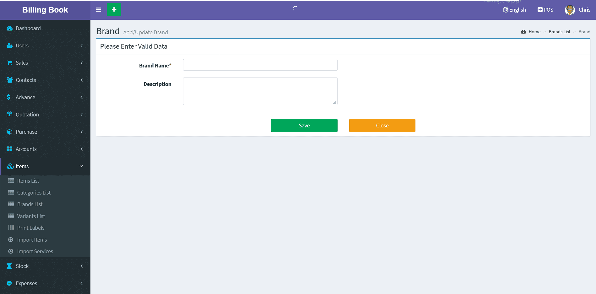 Adding a Brands it's a very easy task. Enter Brand name, description(Optional field) and click on Save button.