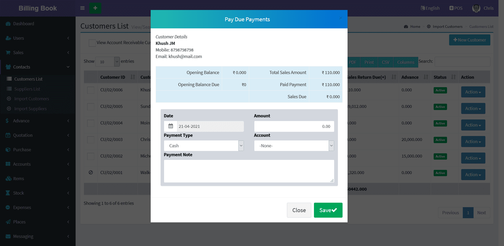 Customers -> Customers List -> Action Button -> Due Payments